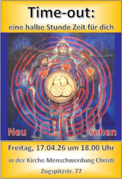 Herzliche Einladung zur Time-out: eine halbe Stunde Zeit für dich heute, Freitagabend 17. April, um 18 Uhr in Menschwerdung Christi (Zugspitzstr. 77). Heute geht es um Neu sehen.