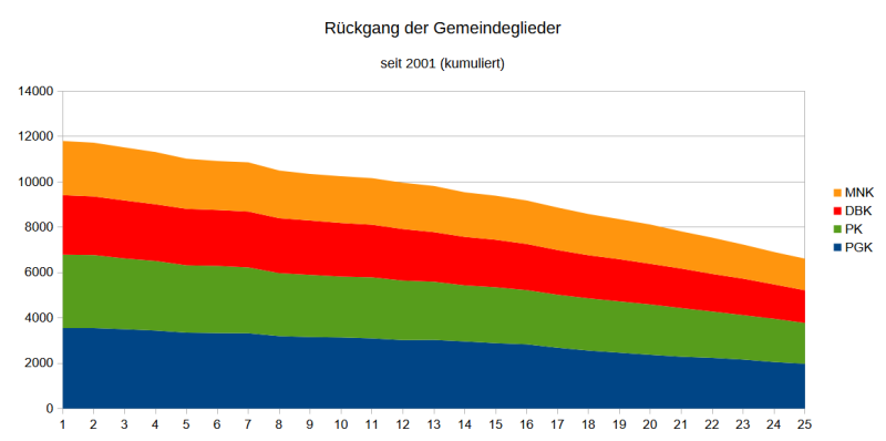 2001 gab es in Langwasser insgesamt 11.804 evang.-luth. Christ*innen. Das ist ein Verlust von 5.193 Mitglieden bzw. 44% in 24 Jahren.